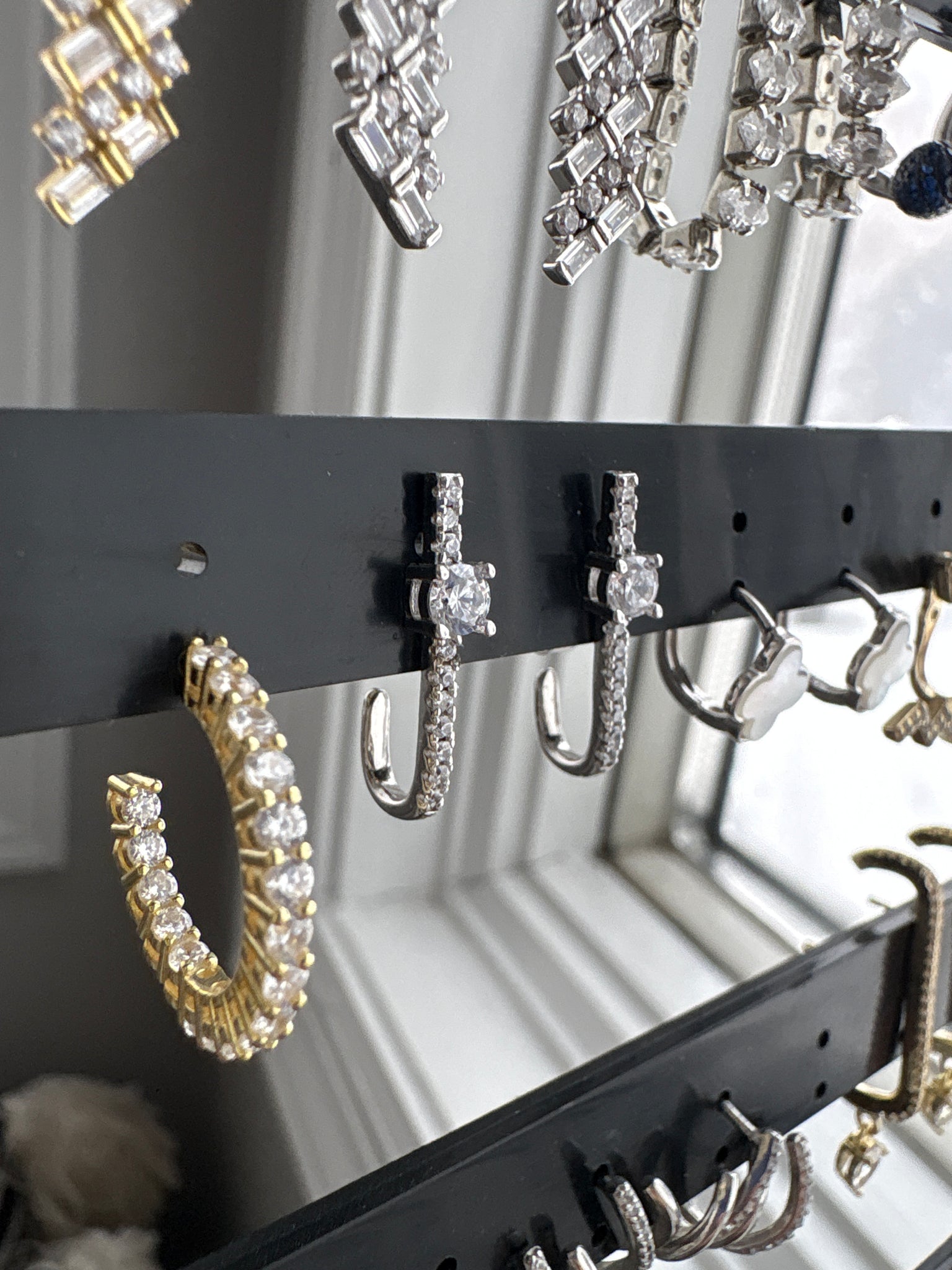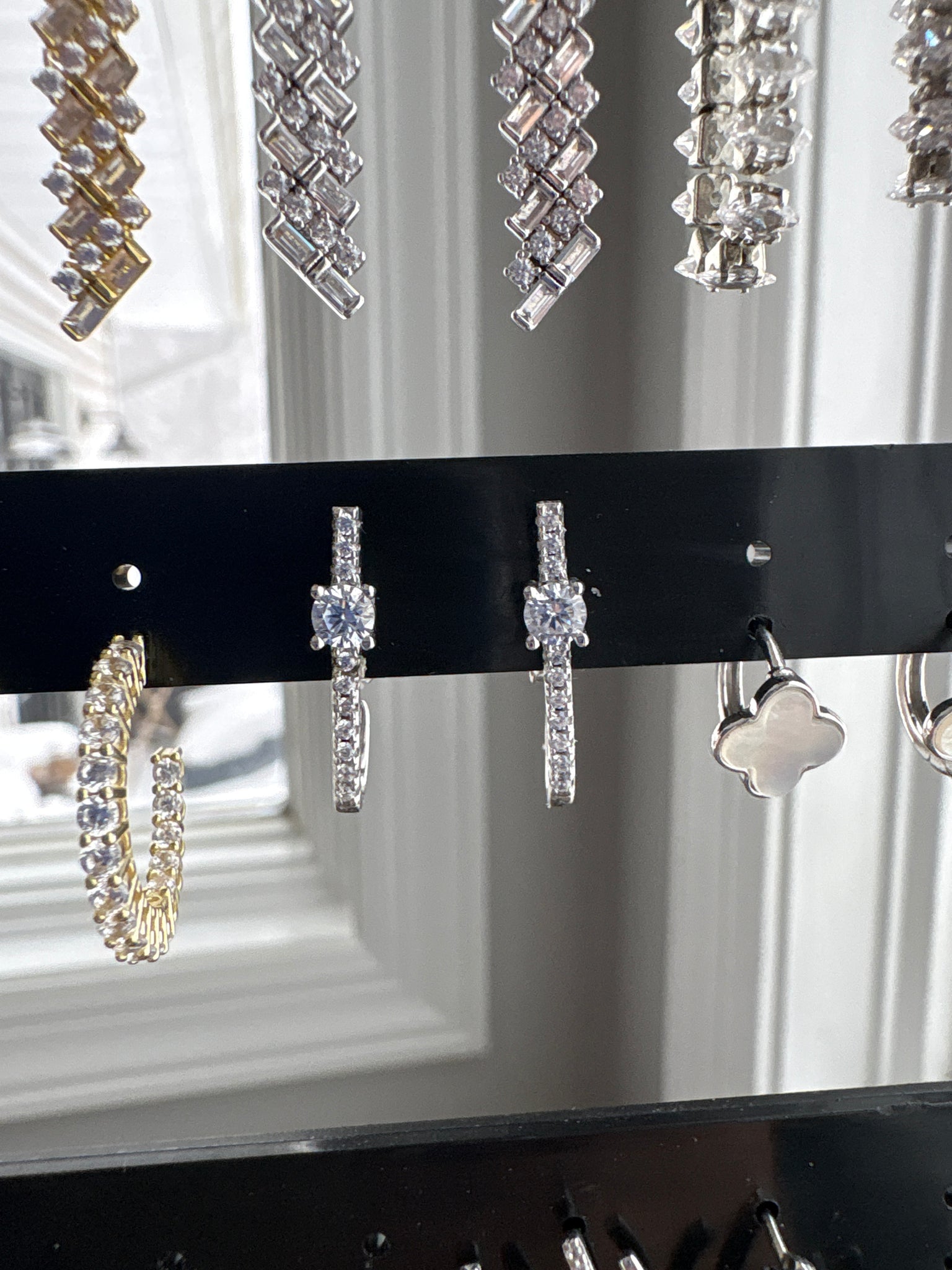 Delicate with just the right amount of sparkle, these modern huggie earrings feature a sleek vertical drop accented with shimmering baguette-cut stones and pavé details. Designed to hug the ear comfortably, they’re lightweight, elegant, and perfect for everyday wear or special occasions.