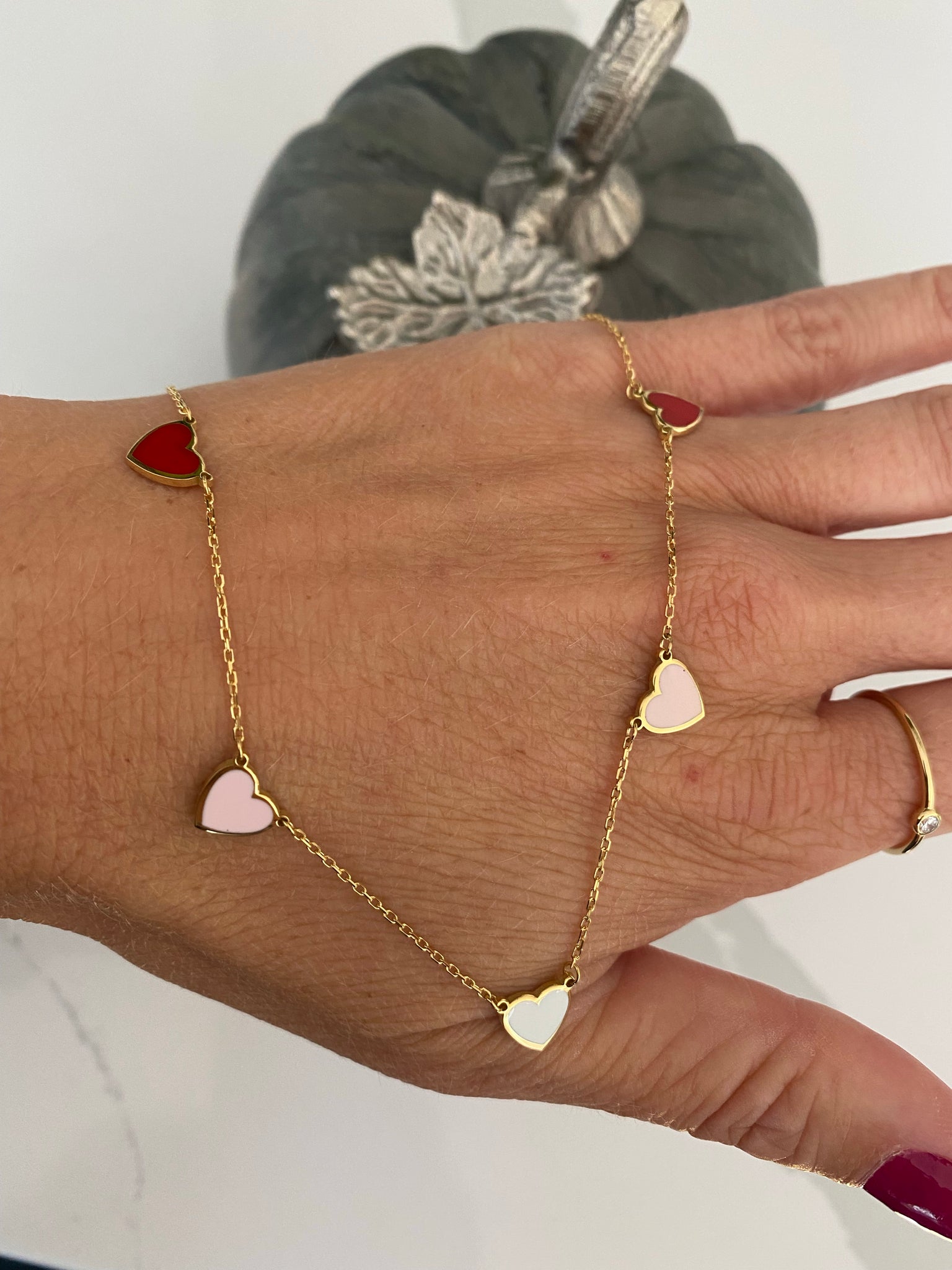 5 heart necklace alternating black and green / gold 20+2” extender sideways hearts